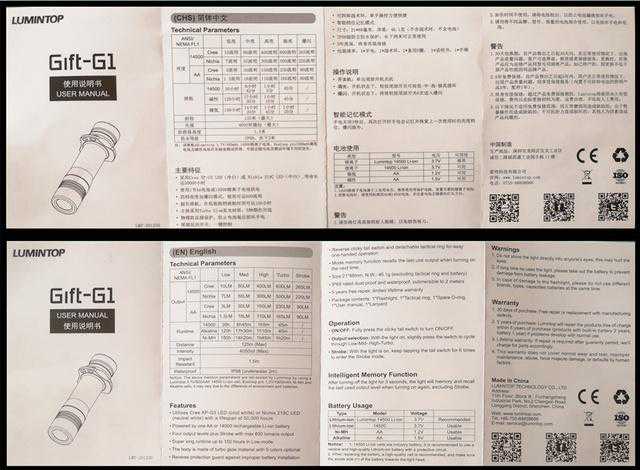 说明书有中英文正反两个页面,主要介绍了一些具体参数,操作方式,电池使用以及注意方面等细节。