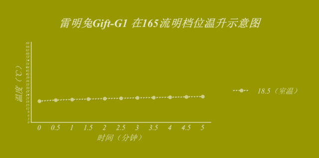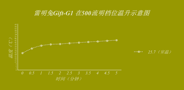 下图是高温快速电子测温仪对这款Lumintop雷明兔G1手电分别使用AA镍氢电池(极亮165流明)和雷明14500电池极亮(500流明)状态下散热性能做简单测试。测试时的室内环境温度分别为18.5摄氏度和25.7摄氏度,无风,静态,测试时间5分钟.由于测试受室温和测试环境位置以及测试者水平的影响,数据可能存在误差情况,以下图表数据仅供参考。由图可以看出,手电在稳定之后温升趋于平稳,没有明显的大起大落。