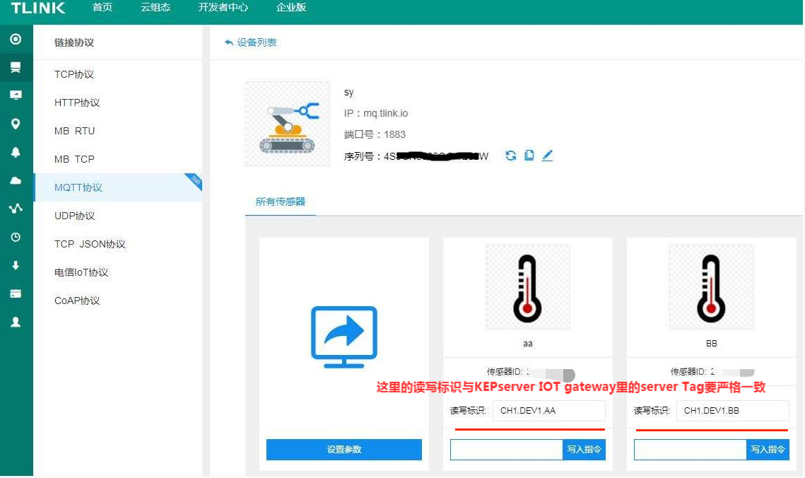 在设置连接页面,选择MQTT协议,记下右侧的IP和端口以及设备序列号;传感器读写标识可先不填写,等在KEPSERVER内创建好后复制粘贴变量名称即可;