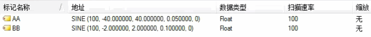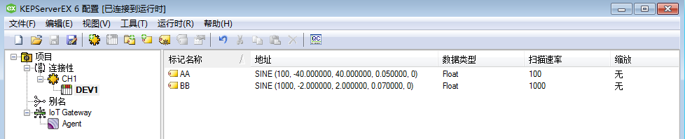 首先创建一个simulator通道CH1,然后在此通道下创建设备DEV1,设备下新建两个变量AA、BB,变量仿真数据均配置为正弦变化数据;