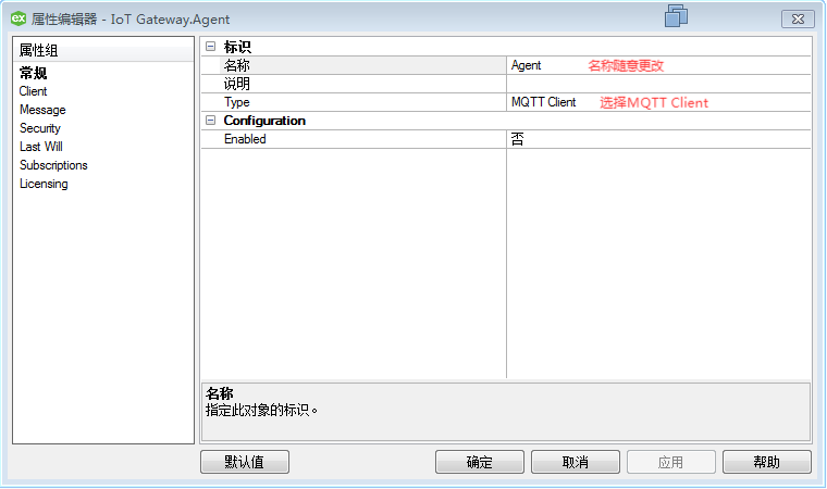 在Agent的属性里,配置常规选项卡,类型选择MQTTClient;