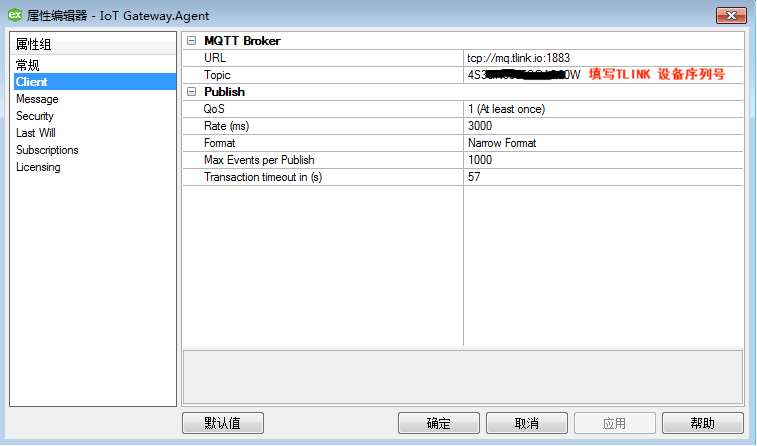 配置Client选项卡,URL为tcp://,与平台的MQTT协议的IP和端口一致,Topic里填写平台创建的设备序列号,其他想配置如下图;