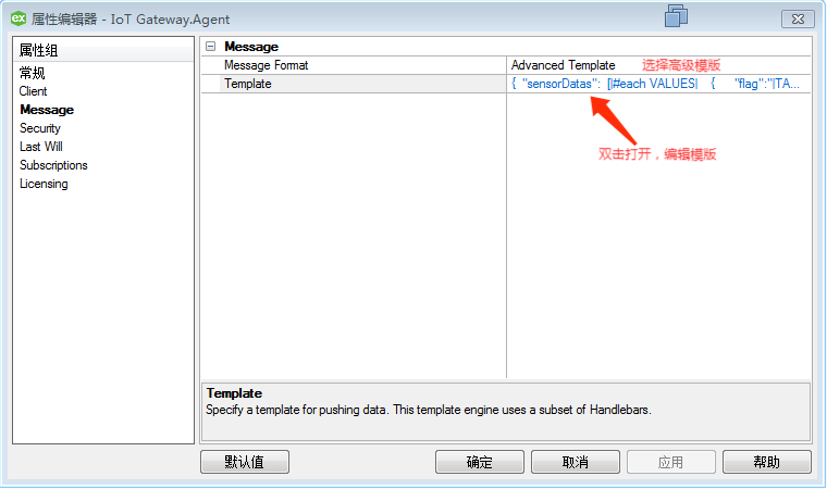 配置Message选项卡,选择高级模版,然后在高级模版里修改;模版的作用是规范发出的JSON数据格式,使之与平台要求的JSON格式一致。