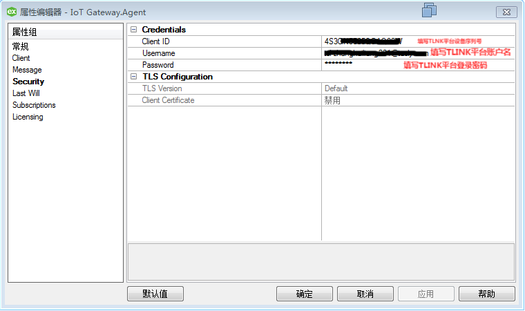 接下来配置Security选项,ClientID填写设备序列号,下面的用户名和密码为平台登录的用户名和密码