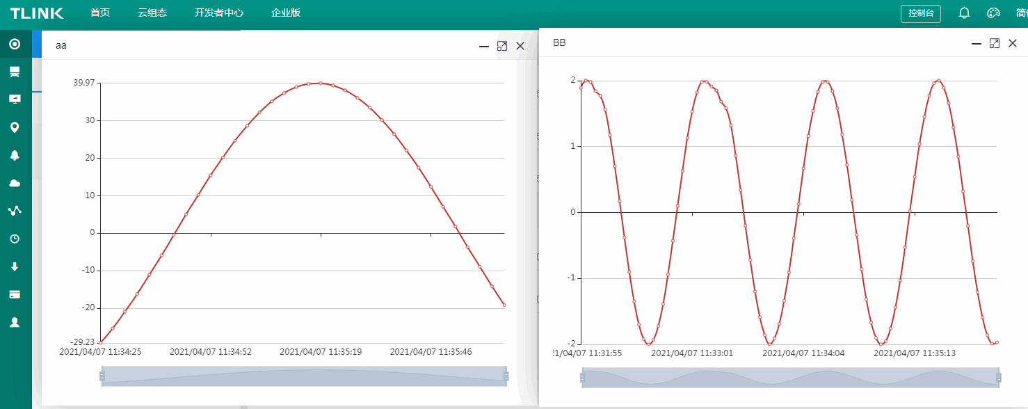 如果一切正常的话,在平台的监控中心应该能看到数据实时变化,点开每个变量的实时曲线,经过一段时间可看到数据形成的正弦曲线