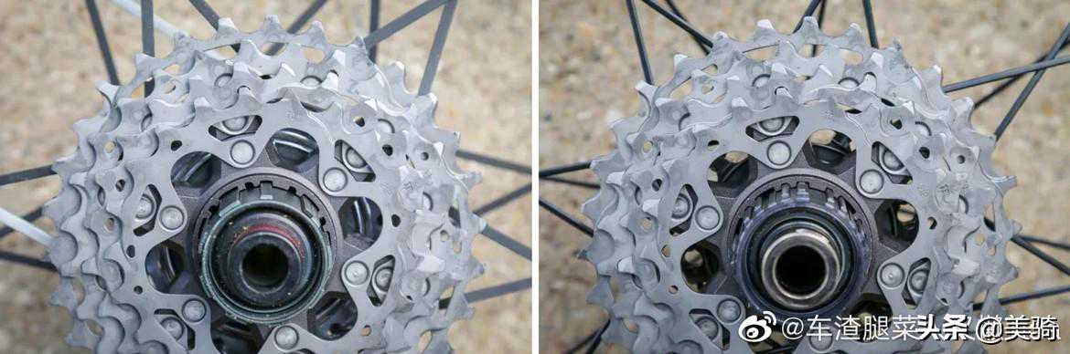 既然说到飞轮了,那么自然要说说大家最关心的飞轮问题。新的12速飞轮使用了特殊的花键造型,可以安装在现有的11速塔基上。但Shimano在DA轮组上提供12速专用的塔基,该塔基花键与MICROSPLINE比较相似,花键更密,飞轮与塔基的结合面更大,可以更有效地保护塔基,同时塔基自身也更加轻量。