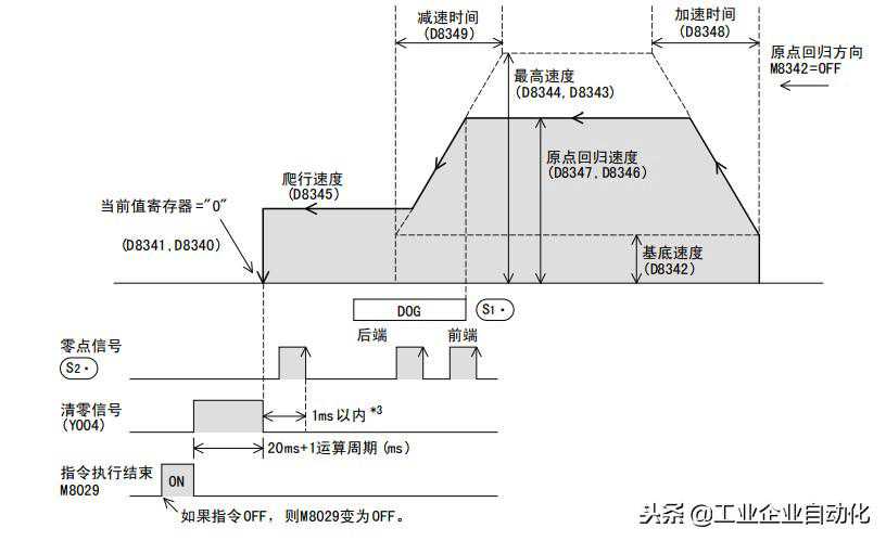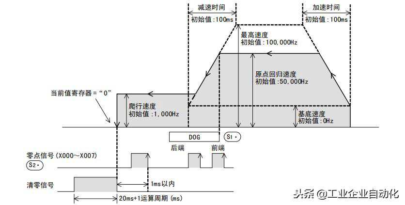 5)S1指定的近点信号(DOG)从ON到OFF后,如果检测到S2指定的零点信号从OFF到ON,则立即停止脉冲的输出。