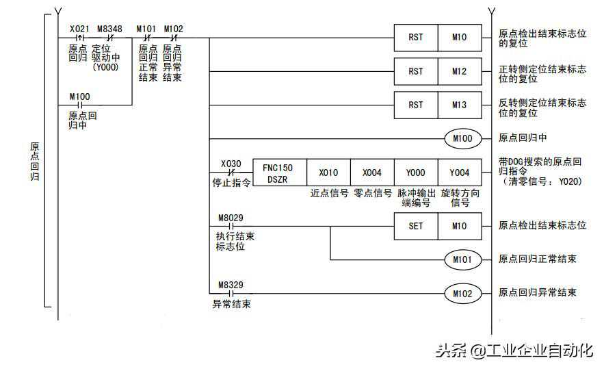 以脉冲输出端指定为Y000为例,说明原点回归动作。如果使用Y001、Y002、Y003时,则请根据使用的输出编号,改读各相关标志位。
