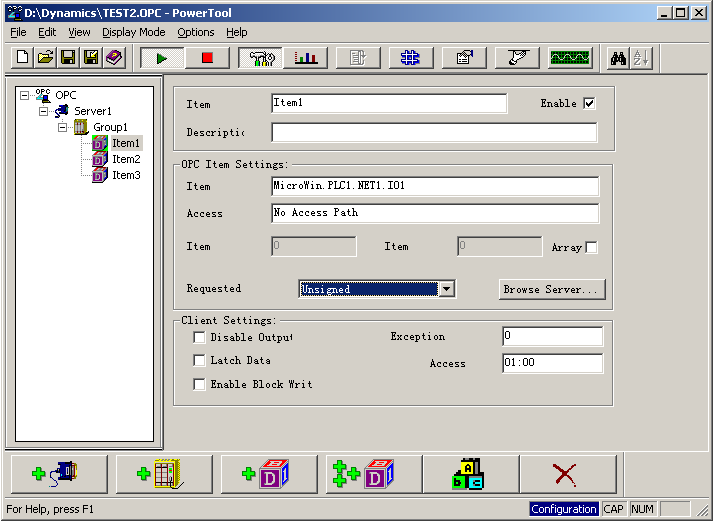 第三,用IFIX作为OPC客户端,PCACCESS作为OPC服务器进行通讯连接。打开OPC客户端,建立相应的项目及TAG点,并Enable。
