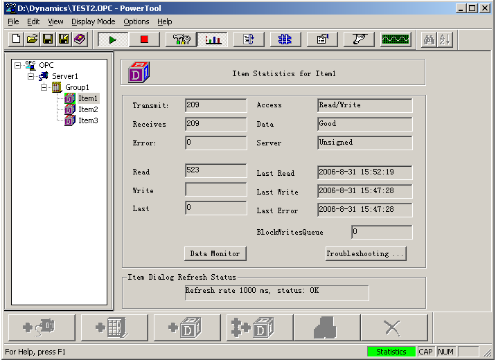 按照上面建立好tag点后进行Client测试,将建立的数据拖到“测试客户机”栏中;启动测试客户机,测试所建项目,如果“质量”为“好”,表示通讯数据正确;
