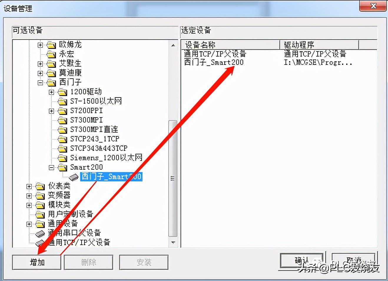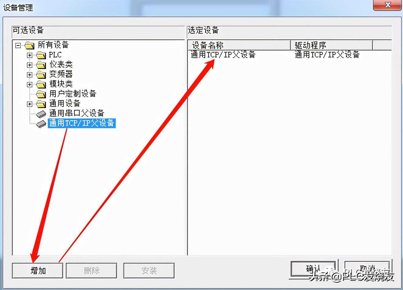 温馨提醒:这里为什么选择通用TCP/IP父设备呢?因为要填加一个主设备,才能填加子设备,这里的子设备是指:通信的PLC、仪表、变频器等!