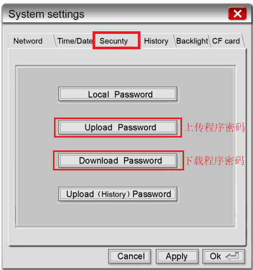 初始化完成后,[LocalPassword]系统设置密码恢复为预设密码111111。但其他密码,包括下载与上传所使用的密码当选择恢复出厂值设定后,皆需重新输入,才能进行正确的上传、下载。
