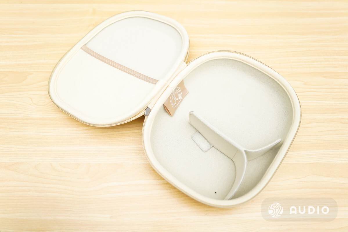 收纳包一览。本次我爱音频网入手的「月牙米」色耳机所附送的收纳包为米色,表层材质主要为皮革,整体大小还是比较大的。