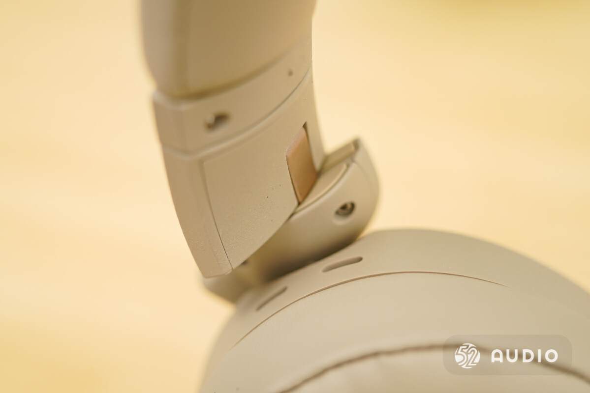 耳罩侧面部分近览。一字形的金属结构为耳罩的可调结构,允许耳罩向内旋转而更贴合双耳。
