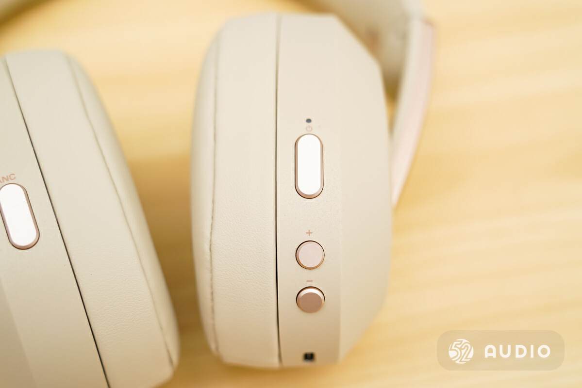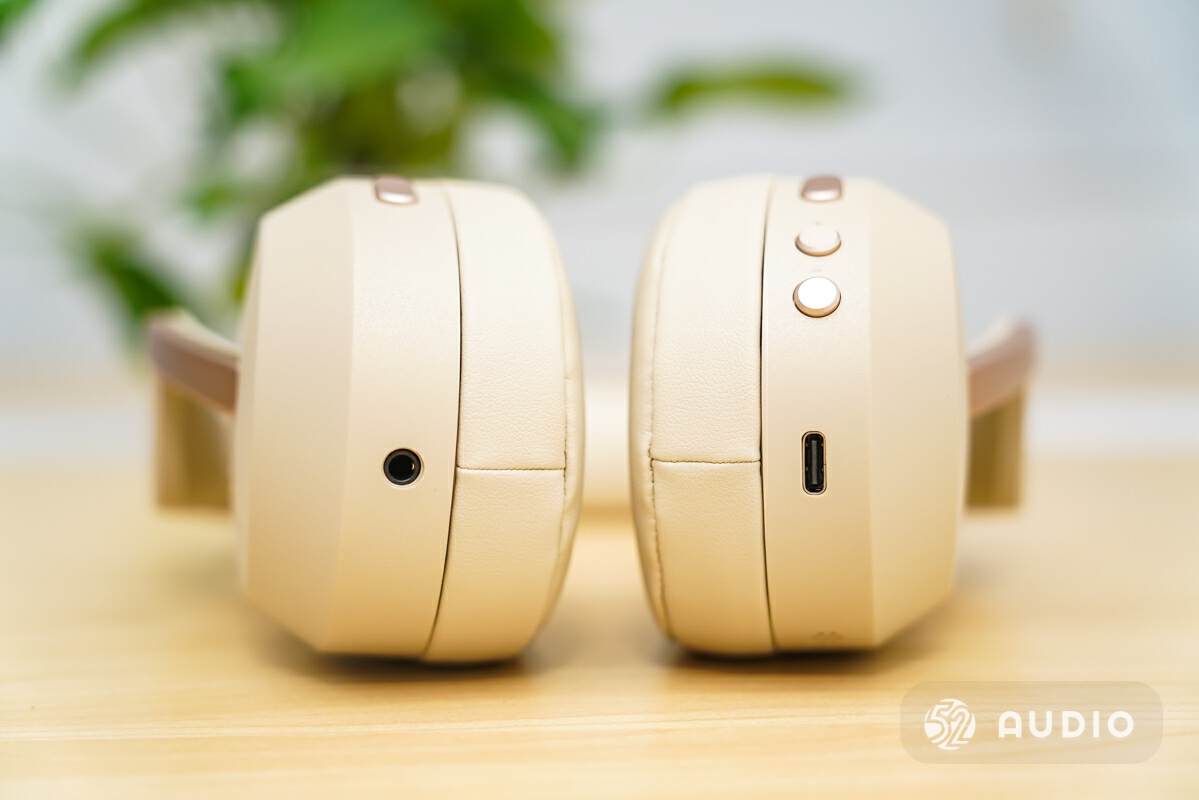 两侧耳罩低侧面设置接口与控制按钮。左侧耳罩底部设置3.5mmAUX接口,右侧耳罩底部则设置USB-C接口。
