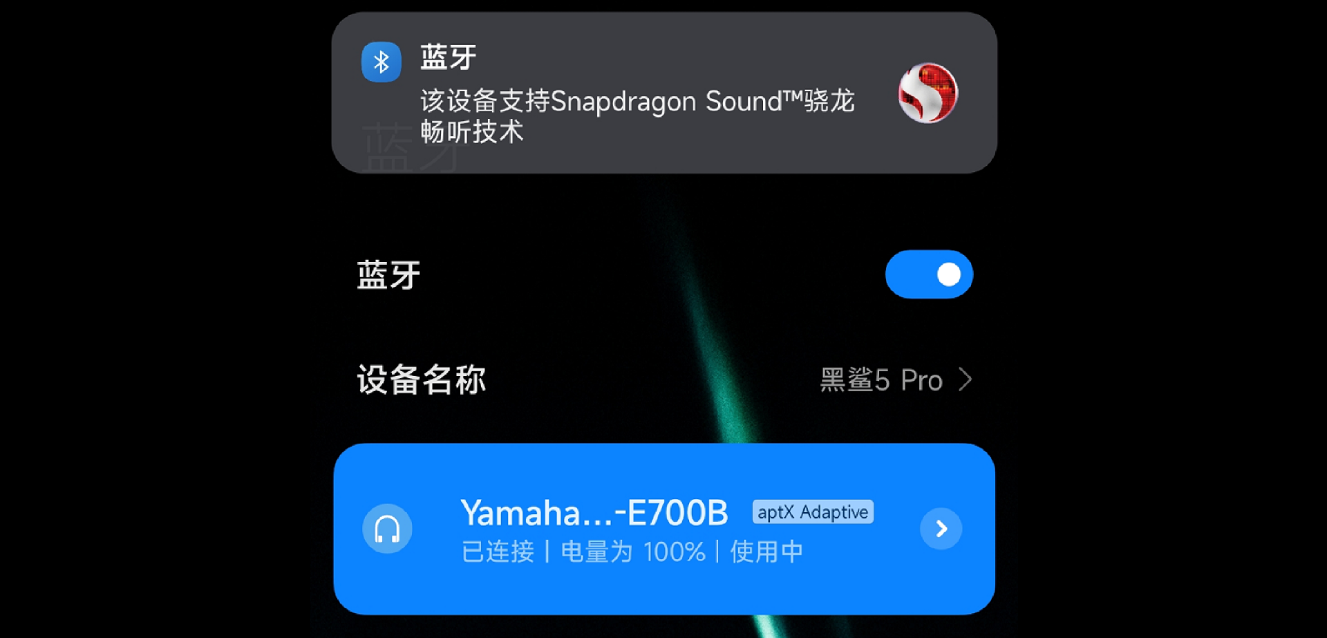 值得注意的是,由于支持SnapdragonSound骁龙畅听技术,在使用相兼容的高通骁龙芯片手机连接YamahaYH-E700B时,手机就会跳出相关提示,并说明耳机正以aptXAdaptive编解码器来连接。