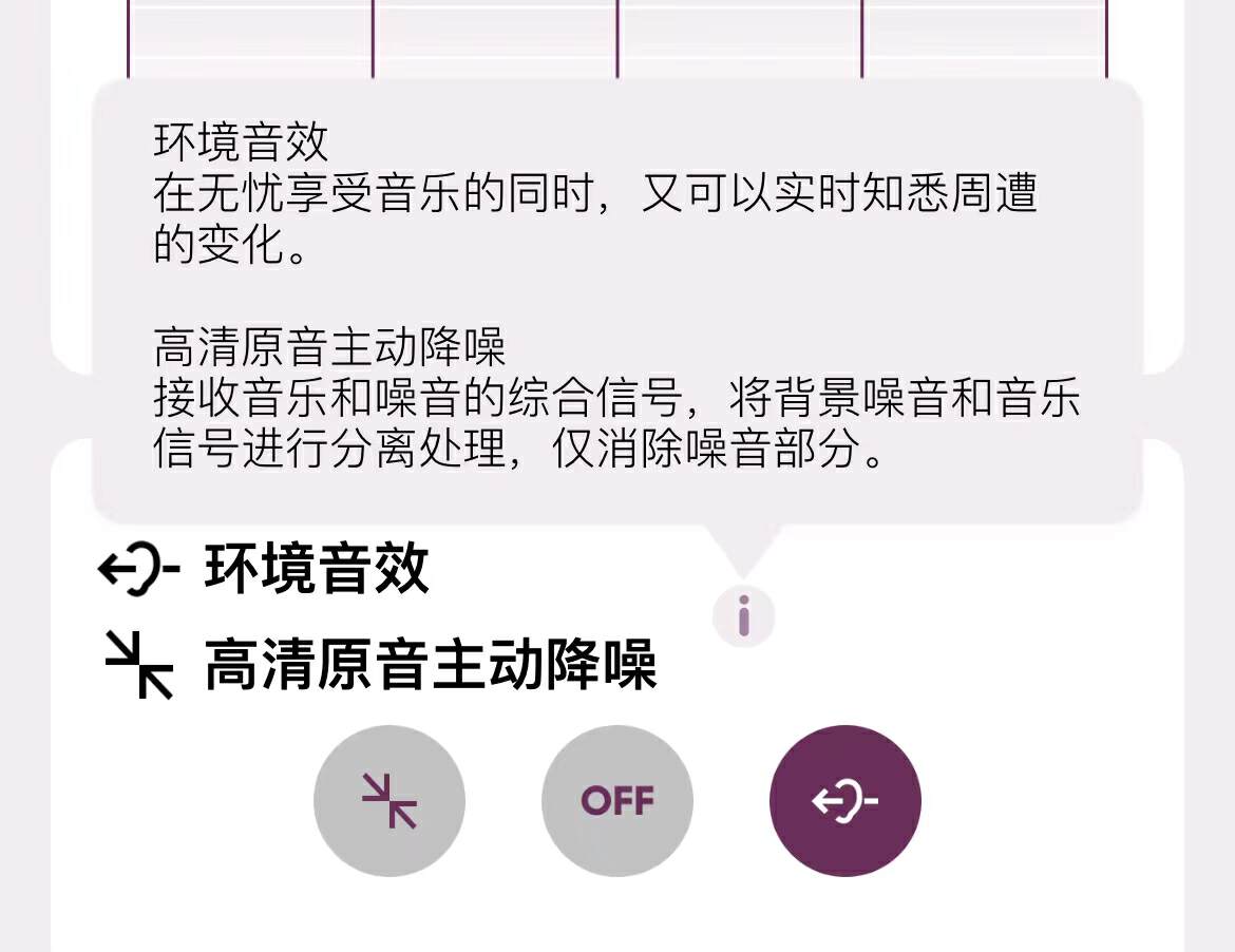 App的界面简单而实用,其包括的主要功能包括EQ均衡器、降噪模式选择、护耳式质响平衡(一种限定最大音量而保护听力的技术)开关、智能识耳音质优化开关以及游戏模式开关,所有常用操作均在一页之内可以完成。