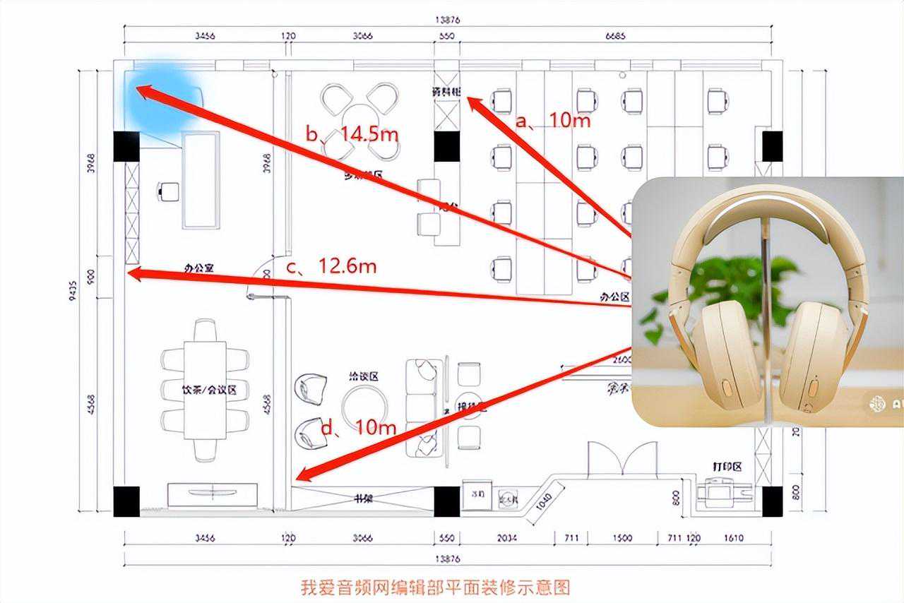 我们将一部手机放置在办公室固定位置(平面图中右侧),然后佩戴连接到手机的Yamaha雅马哈YH-E700B,并沿a、b、c、d四条路线行走,来测试耳机的无线连接稳定性。其中: