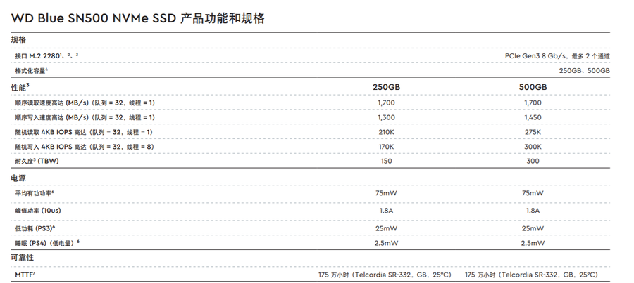根据西数官网的描述,目前SN500只有250GB和500GB两个版本。为规格。
