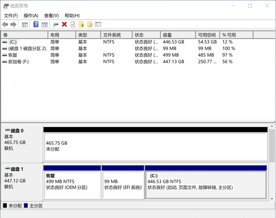 在磁盘管理中可以看到可用空间465.75GB,比较正常。