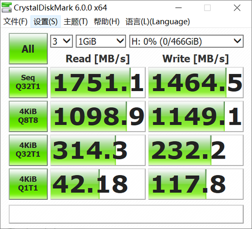 在CrystalDiskMark中,持续读取性能达到1751MB/s,持续写入性能也超过了1464MB/s。4K性能也表现好于同级别的PCI-Ex2产品。