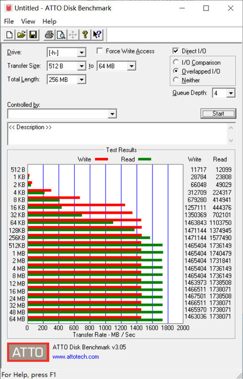 ATTO中的表现则更加夸张,读写最高甚至超过了1738MB/s和1466MB/s。已经超出官方标称性能不少。