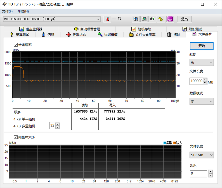 使用HDTune执行100GB的连续写入,可以看到这枚SN500的SLC高速缓存在6-7GB左右,超出之后写入速度回落到750MB/s且保持稳定。