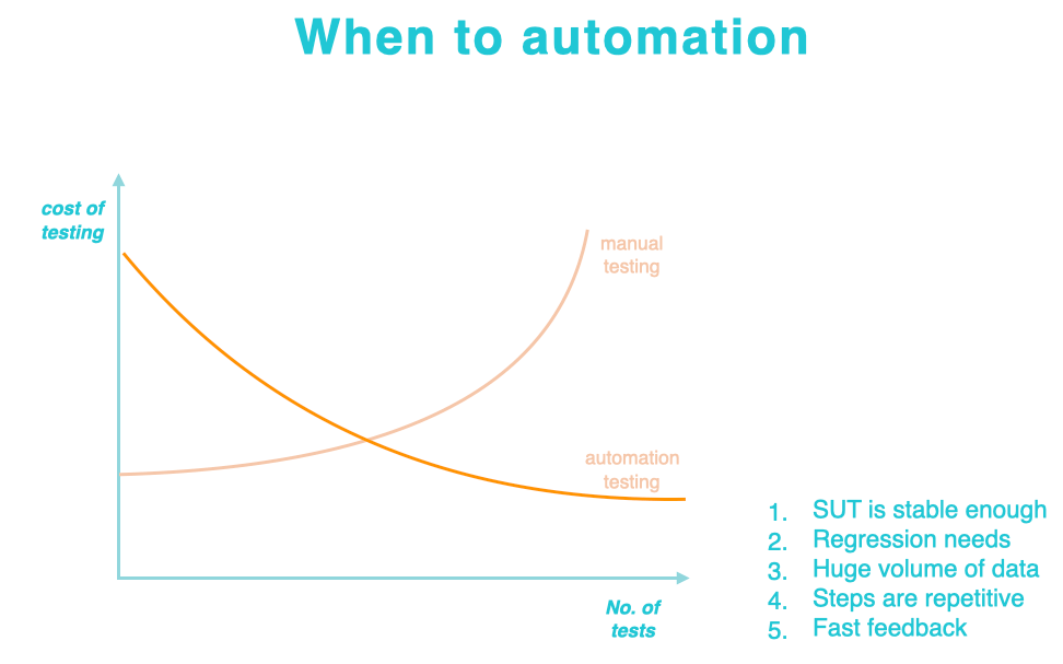 我们选择自动化一定是要考虑项目是否存在客观的现实需求,在动手实施具体的自动化测试之前,一定要对自动化测试的投入产出比做一次客观理性地评估。如上图所示,自动化测试的成本相对单次(或者少量的)手动测试来说是较高的,为了少量的测试活动而做自动化,投入产出比是很低的。需要QA根据项目进度,产品演进程度,测试策略,回归频率等等做一个综合评估,找到出图中交集的点,即何时何种情况团队和产品应该必须引入自动化测试了。因为自动化前期需要投入产品分析,工具框架选型,用例设计,数据环境准备等等,后期还需要持续不断地投入人力进行及时的维护和更新以保证自动化测试的严密性和足够的覆盖率。