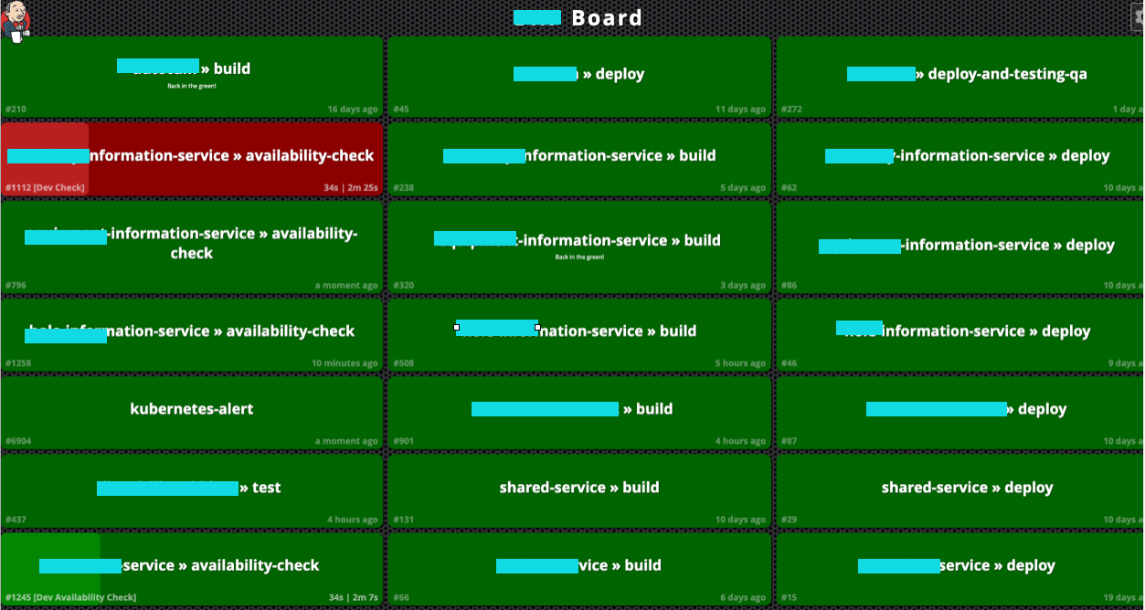 项目上用的是Jenkins自带的BuildMonitorView。将对项目pipeline的监控投影到电视上,并配置相应的提示音,能非常及时地让团队知道最新的构建,部署,测试状态。