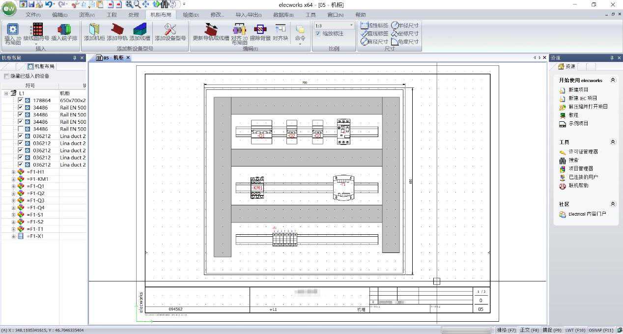 4.面板布局图,基于elecworks参数化的物料库,可自动提取与真实物料选型1:1尺寸的外形图,由设计者完成面板布局。