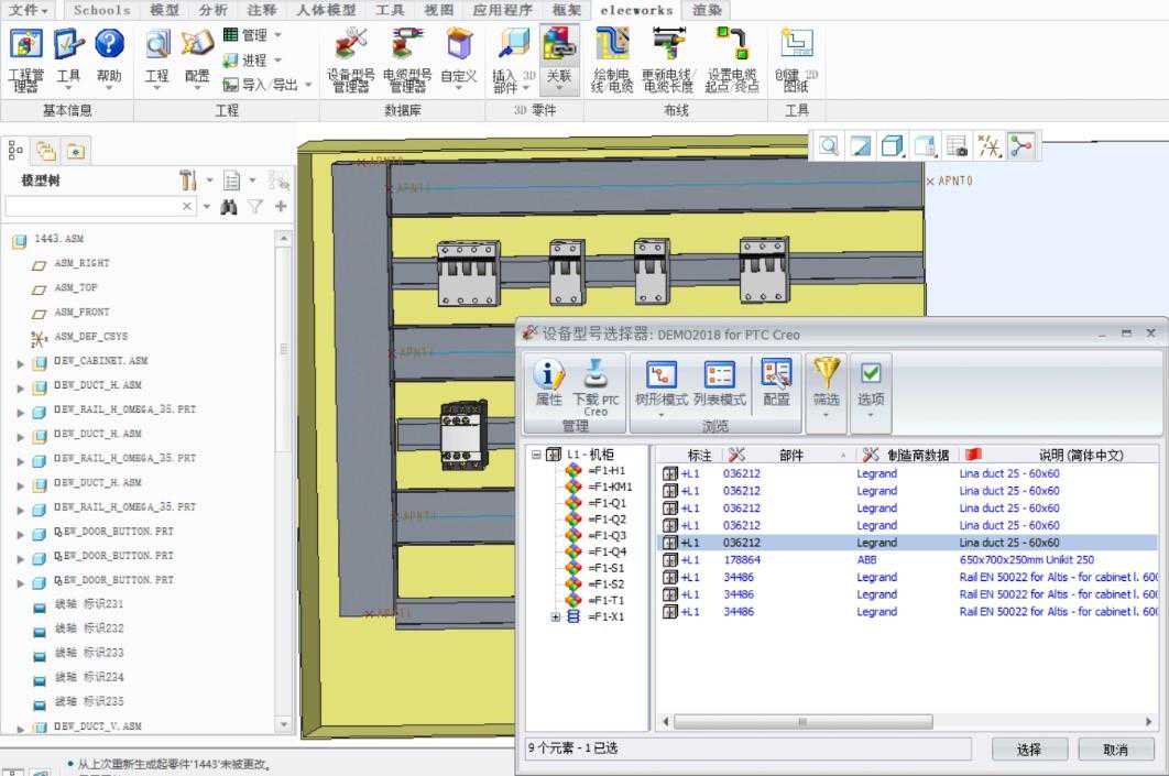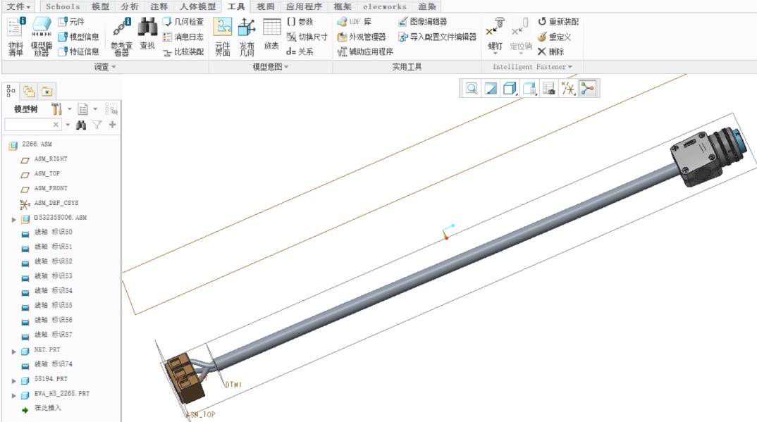前面提到elecworks基于数据库的设计方式,可通过Creo插件直接读取到电气项目数据,并且可以在Creo环境下直接预览电气图纸。打开工程浏览器中的Creo格式文件,通过此方式进入,其实已经建立了电气数据与Creo装配体的关联。