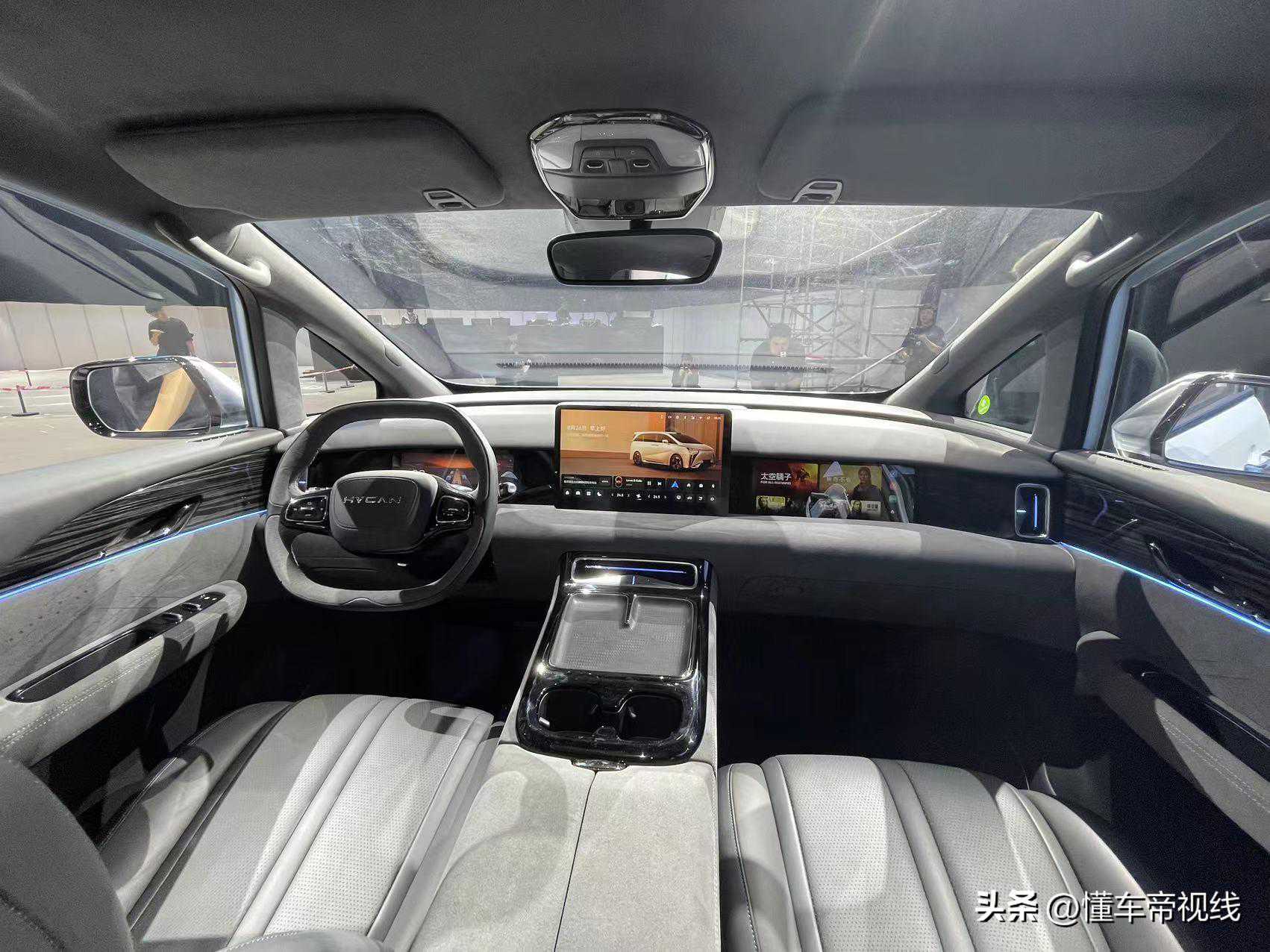 内饰方面,合创V09采用环抱式座舱设计,中控台下方设有三块屏幕贯穿左右,其中副驾驶前方带有娱乐屏,通过悬浮式中控屏幕可以控制车辆大部分功能。细节部分,该车采用双平底造型方向盘和怀挡设计,中控台下方设有空调出风口和手机无线充电板。