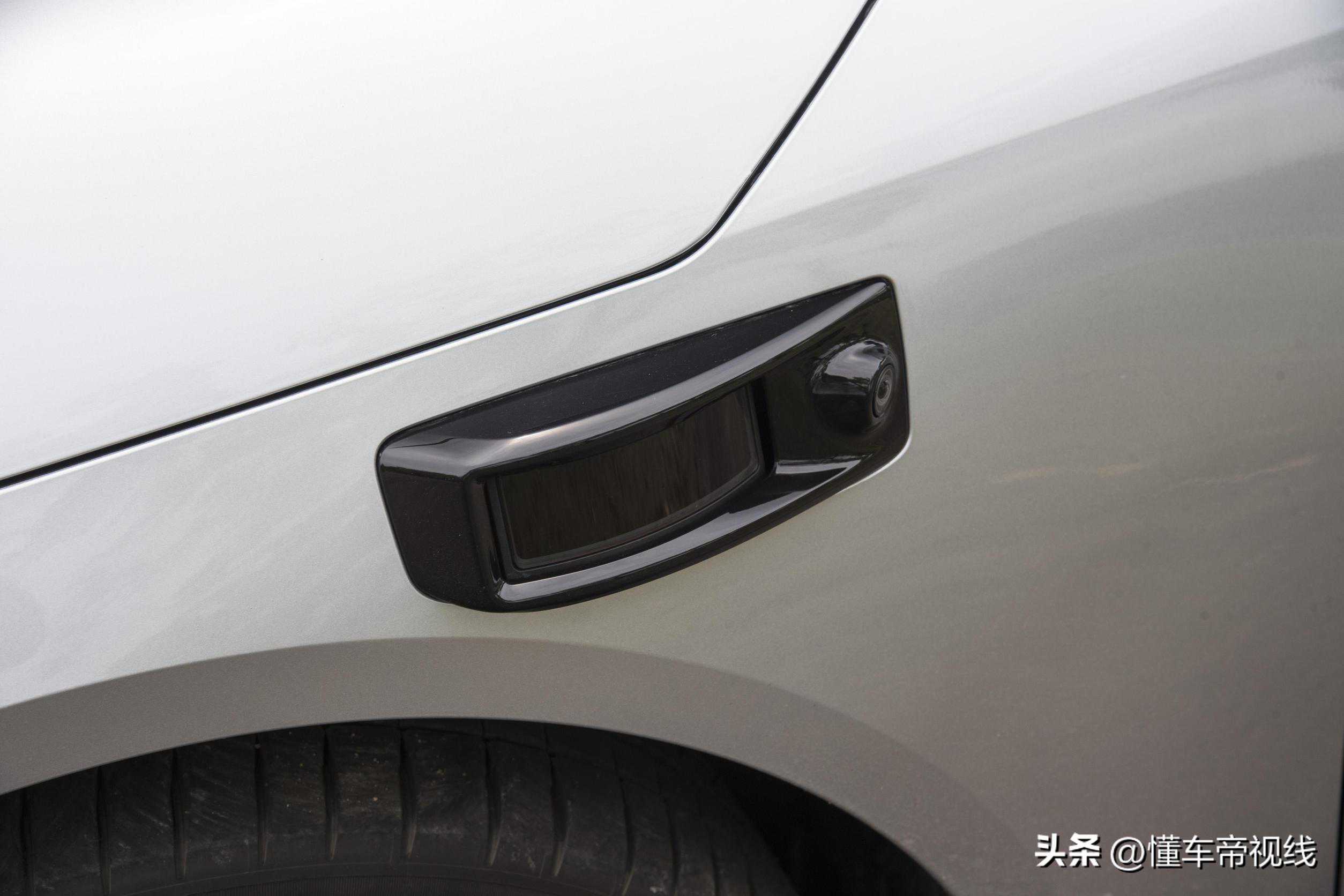 细节部分,合创V09前格栅两侧熏黑进气口结构内部带有三角形灯组,点亮后会进一步增添了前脸辨识度。另外,前格栅底部还带有毫米波雷达,将作为驾驶辅助功能感知硬件。