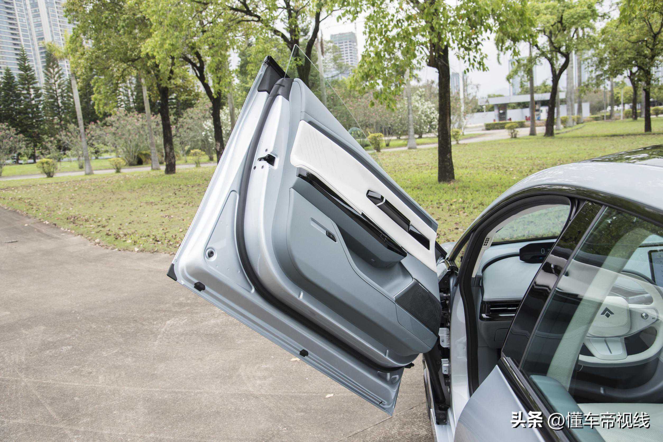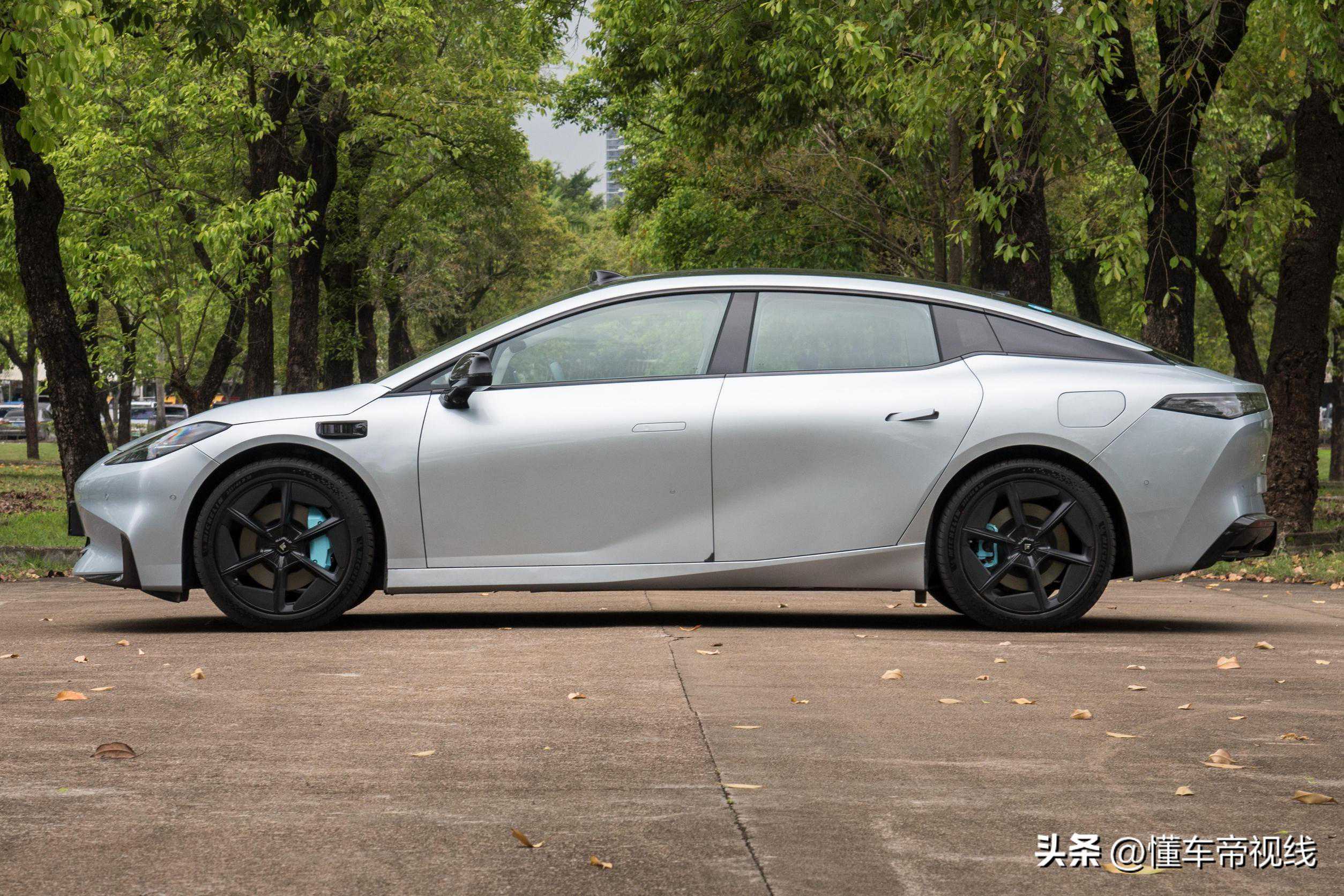 车身侧面,HyperGT并没有采用了太多棱线设计来突出立体感,采用类似于轿跑车型的溜背式设计,并配备隐藏式车门把手。同时,该车还采用了同级别罕见的旋翼门设计,开门宽度达573毫米,配备雷达感知系统和360度环境感知,遇到障碍还可及时调整开门角度。