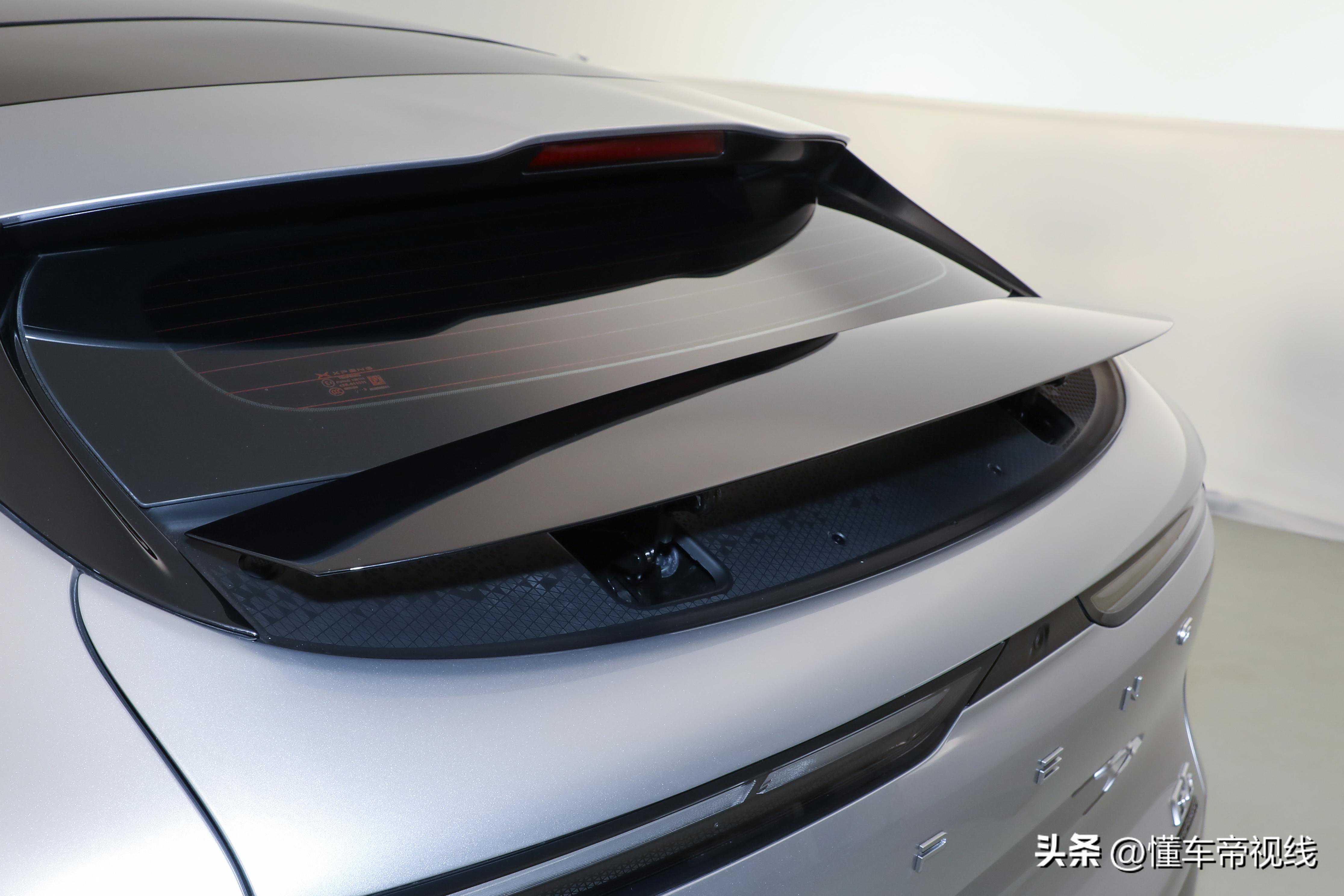 尾部设计上,HyperGT的尾灯组造型狭长,并在中间设计了埃安的英文字母标识,下方后包围也配备了空气扰流板,进一步丰富了尾部的层次感。同时,HyperGT还配备了弧面设计的隐藏式电动尾翼,开启后分三段式打开,高度为108毫米。