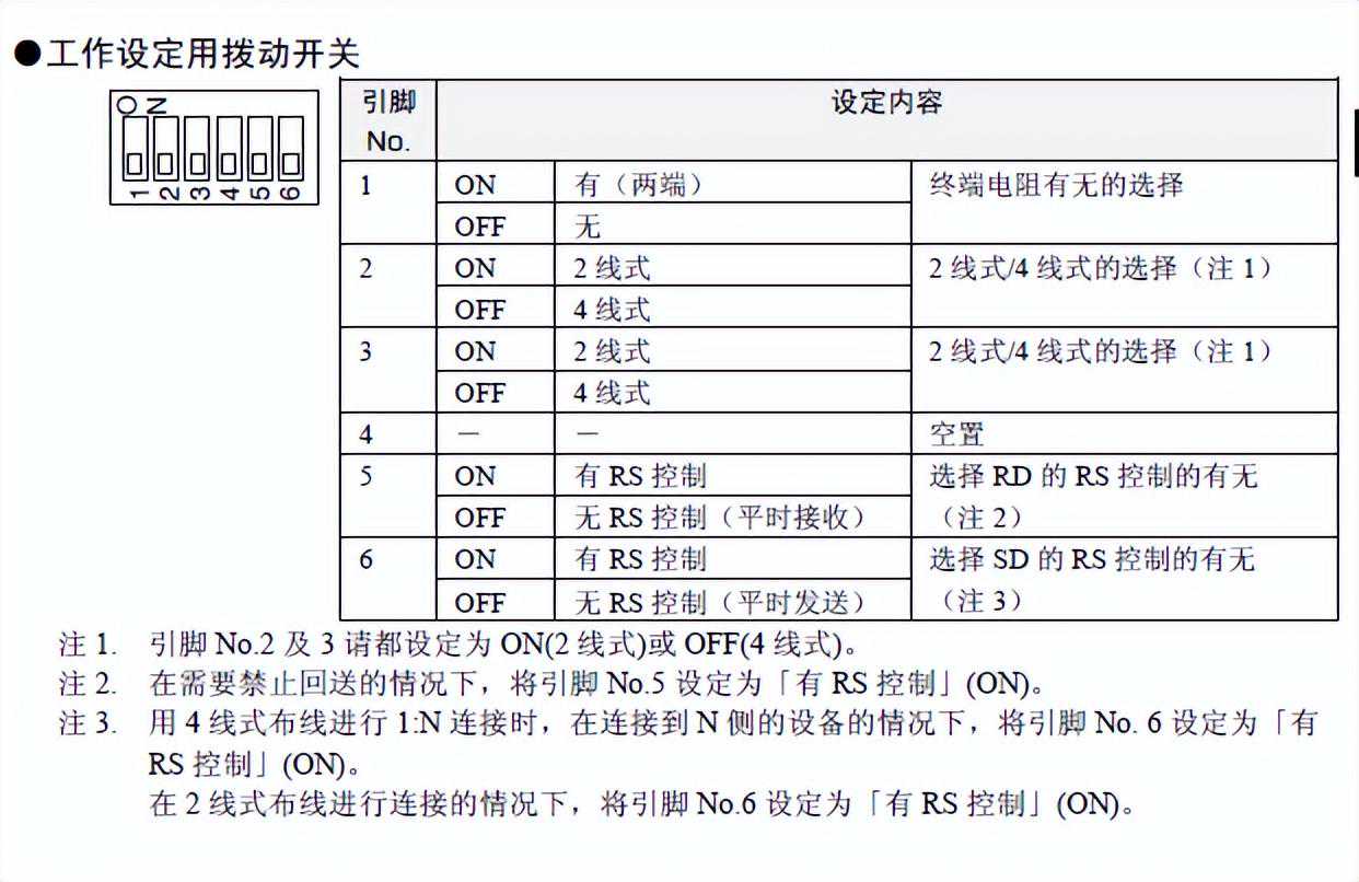 选件板设置:本次实验选择RS-485两线式,2、3、5、6都拨到ON,1号终端电阻拨到OFF。