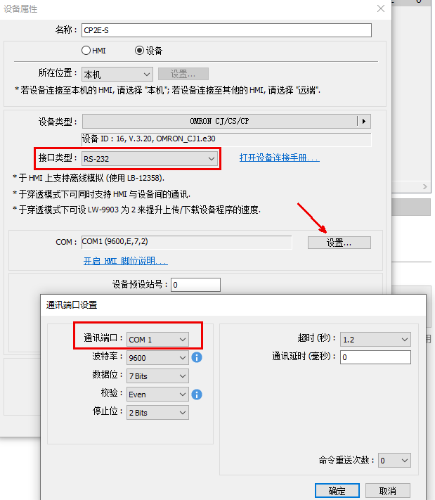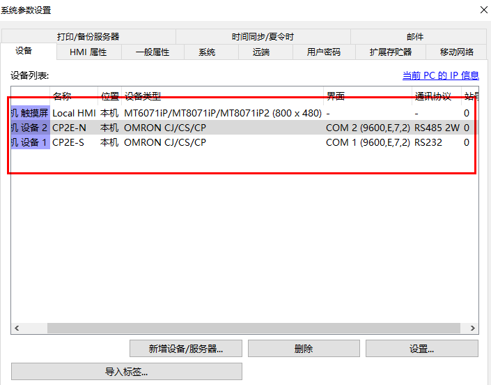 通讯协议:MT8071iP与PLC1(CP2E-S40DT-D)使用COM1口进行RS-232通讯,MT8071iP与PLC2(CP2E-N40DT-D)使用COM2口进行RS-4852W通讯
