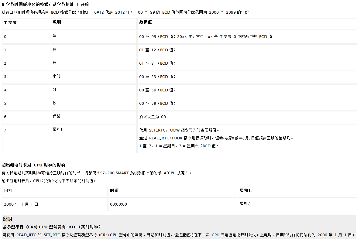需要注意的是,CPU中的日时钟仅使用年份的最后两位数,因此2000年表示为00。但使用年份值的用户程序必须考虑两位数的表示法。