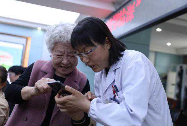 老人在跟医生分享家中的喜事