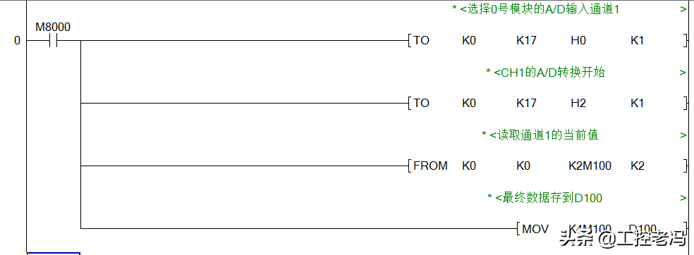 首先K0代表什么意思,代表模块实际安装的位置,这里模块直接与PLC主单元连接,所以是0号位。K17为BFM17由H0变为H2时,意味着其b1位由0变成1。这时候开始A/D转换。比较难理解的是From这里,因为当前值是有12位的。K2M100只能存八位,剩下的高四位被存放到K2M110。所以最后是把K4M100存放到D100。然后D100再经过D/A转换就可以得到我们想要的物理量了。注意K4M110这个组合位原件所占用的M区在程序的其他地方就不要再用了哦。会发生误动作的。