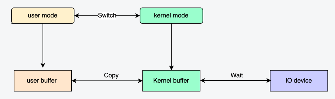 通常读写操作的数据首先从用户缓冲区进入内核缓冲区,然后由内核缓冲区完成与IO设备的同步: