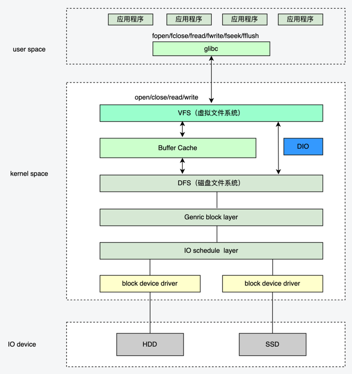 直接IO的方式比较简单,直接上文提及的open函数入参中指定O_DIRECT即可,相比普通IO操作,略过了内核的缓冲区直接操作下一层的文件文件。该操作比较底层,相比普通的文件读写少了一次数据复制,一般需要结合用户态缓存来使用;下图所示为DIO透过buffer层直接操作磁盘文件系统: