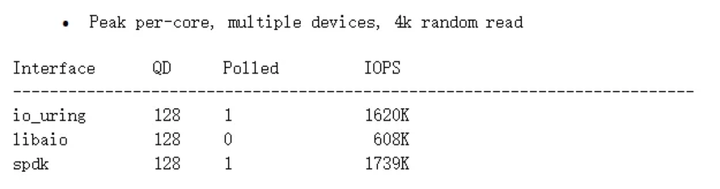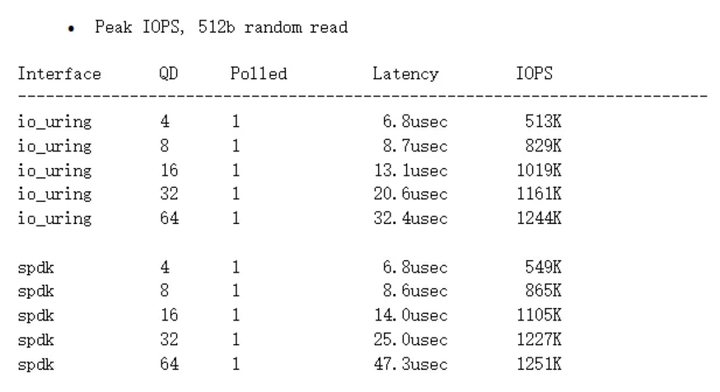 io_uring在非polling模式下,相比libaio,性能提升不是非常显著。io_uring在polling模式下,性能提升显著,与spdk接近,在队列深度较高时性能更好。