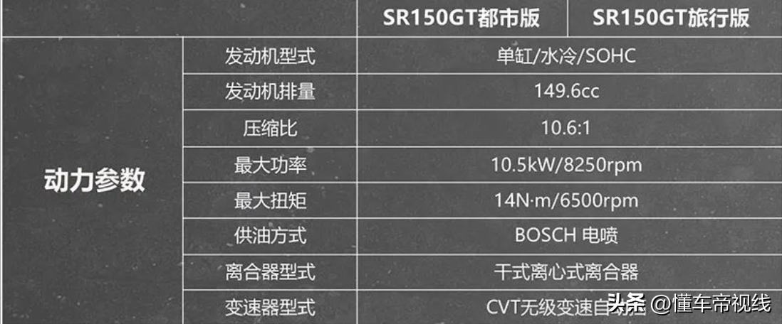动力部分,无极SR150GT都市版/旅行版均搭载149毫升单缸水冷发动机,最大功率10.5千瓦,最大扭矩14牛·米,传动系统匹配CVT变速箱。另外,该车油箱容积为8升。您觉得这款车怎么样?欢迎留言讨论。