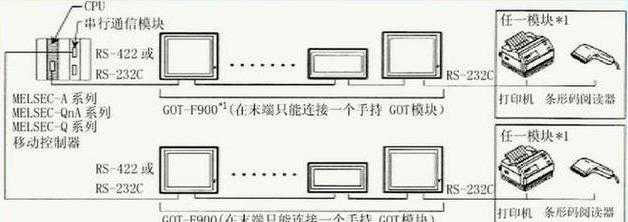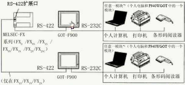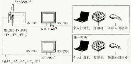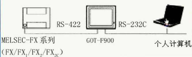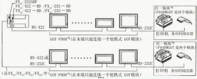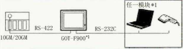 F900GOT(F920GOT-K除外)可以直接和FX定位模块(10GM/20GM)的编程口(RS—422)相连,通过GOT的RS232C接口,可以和个人计算机、打印机或条码阅读器相连。