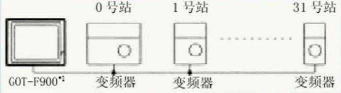 F900GOT(F920GOT-K除外)和FREQROL系列变频器内置的PU端口相连。一台F900GOT最多可以连接10台变频器。