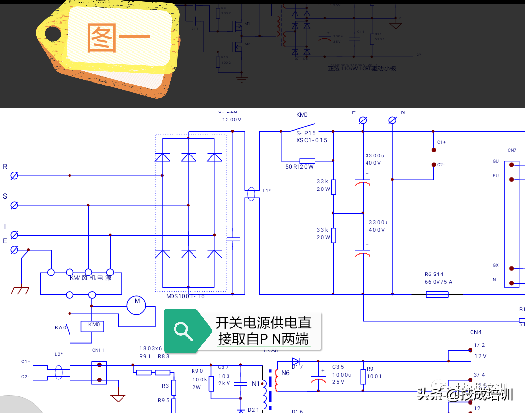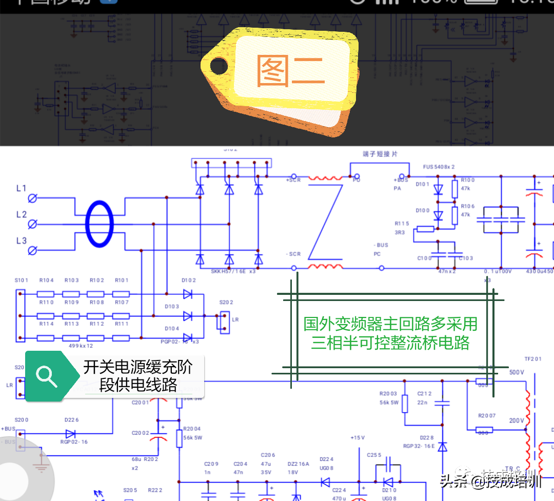 补充:在该类型变频器通电初始状态,开关电源线路部分的供电由图示左下角的三相半波整流电路提供,待充电过程结束后再切换到主回路直流母线供电方式。