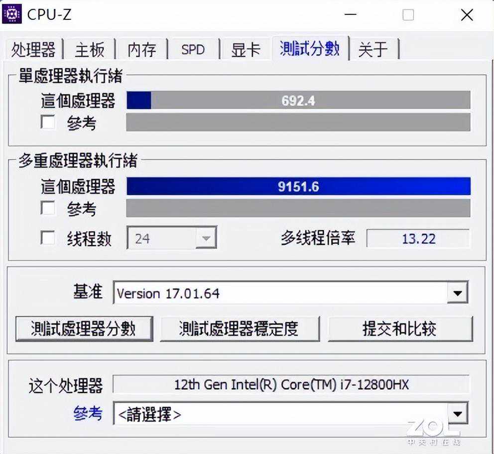 首先我们看看CPU-Z测试,实测其单核性能评分692.4,多核性能评分9151.6,从测试结果来看,微星冲锋坦克ProGP76HX相当完美地发挥出了这颗处理器的单核和多核性能,说明这款产品的性能调校极为出色。
