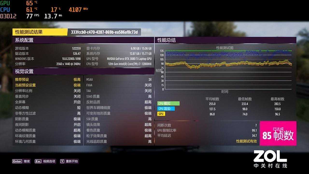 最高画质,2.5K分辨率平均帧率高达85fps,游玩体验非常爽快。配合240Hz高刷屏,竞速类有游戏的体验就是“丝滑”。