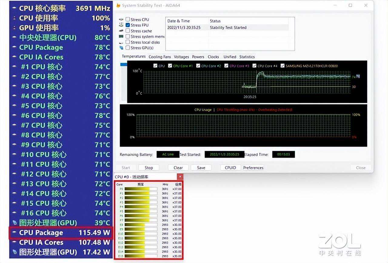 首先在AIDA64StressFPU压力测试下,处理器16个核心温度在71℃-78℃之间,功耗稳定在115.49W,P-Core频率稳定在3.7GHz,E-Core频率稳定在3.0GHz。115.5W功耗能够控制在80℃以内,而且频率保持3.7GHz,这样的表现可以用“恐怖”来形容。